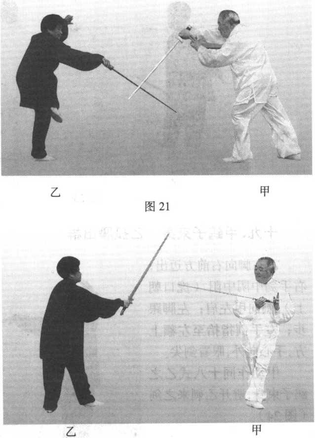 甲右手剑向里裹 成太阳(手心朝上); 左脚稍后撤,脚尖外 摆;左手手心抵住剑 首;两腿成剪子股式, 以右脚掌为轴,身向左 转;剑抽至右胸前,以 此转身抽剑将乙剑提 压。眼看对方。乙剑被甲剑压住, 则右手沉腕压剑柄,将 甲剑崩开,左手迅速下 落扶住右腕;左脚同时 落在右脚后面,重心偏 右腿成弓步。眼随剑运 转(图22)。