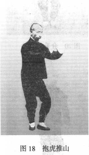 再将两手心朝外着,一齐往前推去 与心口平,两胳膊似曲非曲,似直非直, 两眼看两手当中,停住。左足与两手往前 推时,同时极力往前迈步,右足亦随后紧 跟步,离左足一二寸许,身子高矮与前式 仍是一律,勿散乱。腰要塌住劲,又要松 开劲。周身内外之气与劲,仍如前松沉。 外形虽微停,而内中之意不可止,是在学 者意会之(图18)。
