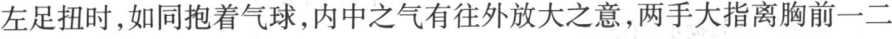 螺丝轴旋转之意,向着右边扭转,扭至左足正直,身子扭转亦总要一气,不可 有忽起忽落,间断之形式,劲亦要和平,不可有努力乖戾之气象。再在两手与