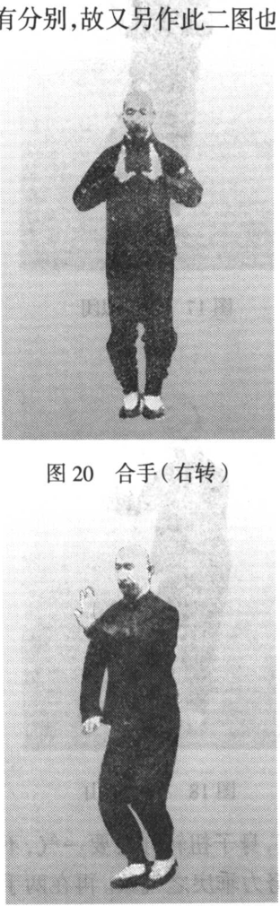 寸许,平着分开,开至两手虎口,与两肩尖相 对,两手五指俱张开,微停(图19)。第十七章合手学(右转)■ ■ ?两手同时再往一处缩窄,两手相离,两腿 弯曲,两眼看处,身体动作,均与第四章、第五 章幵合形式相同。但彼式身子是向左转,是右 足转。此式身子是向右转,是左足转,因身足乂图20)。图19开手(右转)孙式太极拳诠真第十八章搂膝拗步学(右式)