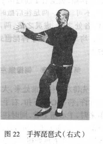 先将两手五指均伸直,手虎口朝 上着,左足即速再往后撤步,足尖着 地。随即将左手往回拉,拉至心口前停 住。右手与左手往回拉时同时往前伸 去至极处。右足亦同时往后撤,撤至左 足前边,足后跟与左足相离半寸许,足 尖着地,停住。左足后跟与右足往回撤 时,足后跟亦着地。身子往回撤时,内 外之神气轻灵一切,皆与第十二章相 同(图22 )。