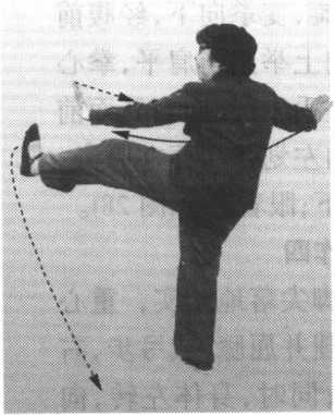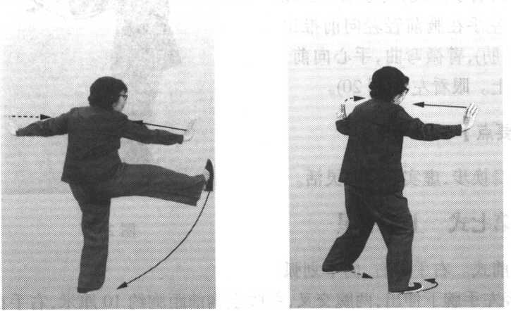 右腿微屈站稳,左膝提起,左 腿向左前、向上慢慢蹬出,足尖向 上,腿自然伸直,高过腰部;同时, 两手如“单鞭式”分开,左手伸向 左足方向。眼看左手(图25)。