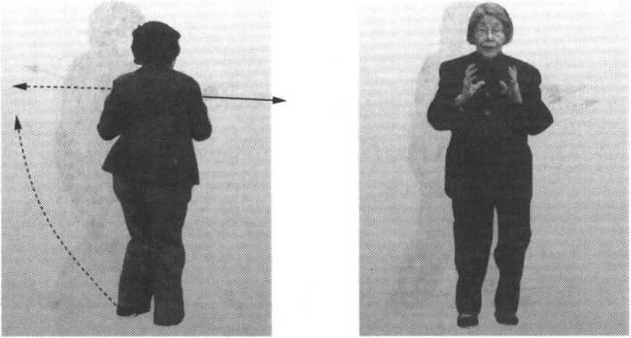 右足往左足前迈一步,足尖外摆,重心移向右腿,身体微右转;同时,右 手内旋,搂回胸前,手心向下;左手外旋经右手下前伸,手心向上。眼看左手 (图 27)0