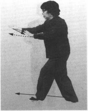 右腿屈膝微移,右足向右前下落,微内扣,重心移向右腿;两臂慢慢向下 沉肘;接着左足移至右足内侧,脚尖着地;同时,上体微左转,两手微里合。眼 看右手(图23)。