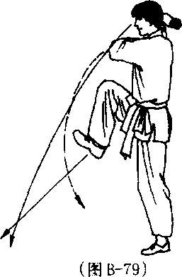 前跃进一步,落地直立,右腿屈膝 提起,脚尖勾起向前,右膝高与胸 平;同时两拳变掌回带,五指分 开,掌心向上,置于右肩上方;目 视前方。(图B-79)