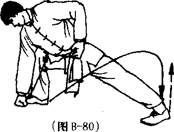 (2)接上动,上体前倾,右脚 向前落步,屈膝半蹲,左腿蹬直成 右弓步;同时两掌抓握变拳向前、 向下用力猛拉,右拳拳心向后,拳 眼向左,拳面着地置于右脚尖内 侧;左拳屈肘抱至腰间;目视地 面。(图 B-80)