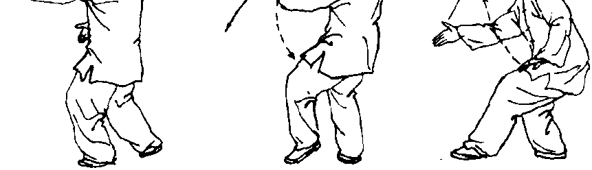 【要点】动作过程有向左、向右再向左共3次微转身,完成姿 势,胸向正西;上体不可太前倾,避免低头和臀部外凸。左腿要屈。