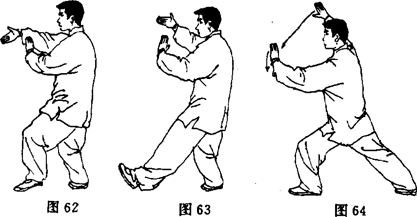 上体微右转,左脚提起向前上步,脚跟着地,而后左腿屈膝前 弓成左弓步;同时右手由体前上提,屈臂上举,停于右额前上方,掌 心翻斜向上,拇指向下;左手上起经胸前向前推出与鼻同高,掌心 向前;眼看左手(图62、63、64)。