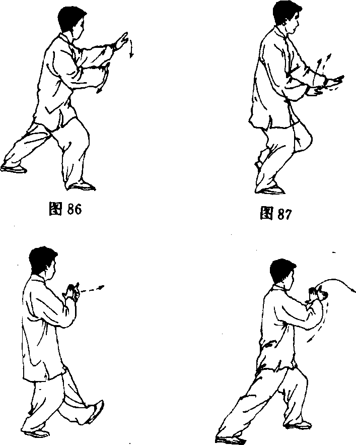 (10)重心前移,成左弓步;两臂同时向前(东北)挤出,两臂撑 圆,高与肩平;眼看前方(图89)。此为“左捋挤势”定势。