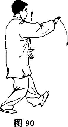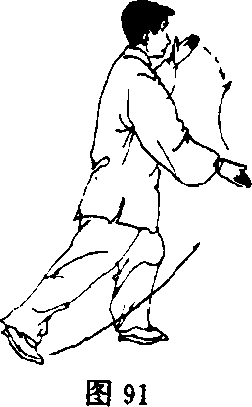 (2)上动不停,两手腕在胸前上下相搭,两掌心均向后上方;同 时左腿蹬直,右腿屈膝提起,右脚尖下垂;眼看右前方(图92)。