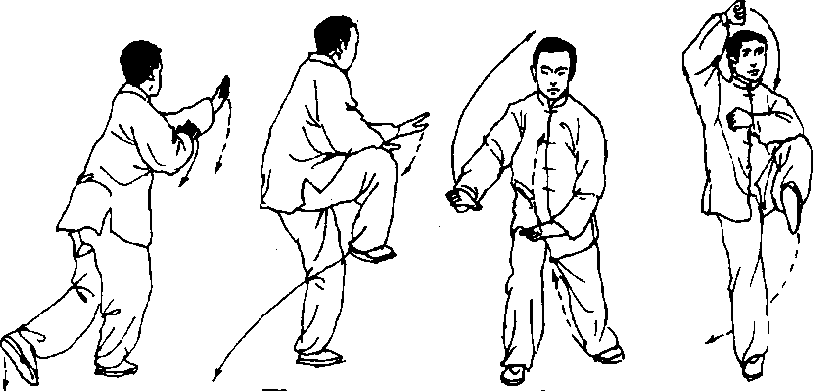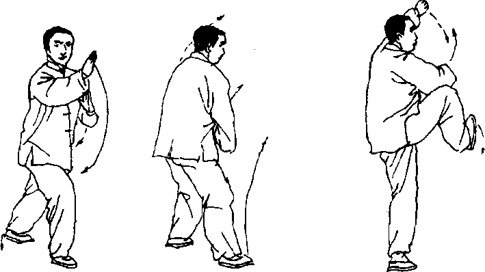 (1) 右腿屈膝下蹲,左脚屈膝向右后方落步;左手稍向右合,右 手向左合至左肘关节内侧;动作不停,左脚跟落地踏实,重心移至 左腿,右腿屈膝提起;同时两手向下降至腹前;眼看左手(图135、 136)0