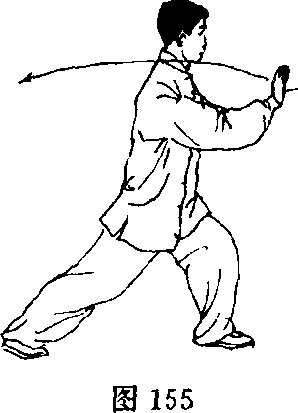 (1) 重心右移向右腿并屈蹲,右脚尖稍外摆,上体右转(胸向南 偏西),左腿自然蹬直;右掌弧形分摆至身体右侧,两掌左右平举于 身体两侧(偏前),两肘微屈,掌心斜向前;眼看右掌(图156)。