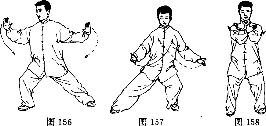 南);两掌向下、向内划弧,经腹前两腕相交,两掌合抱举至胸前,右 掌在外,掌心均向内;同时右脚内收,两脚与肩同宽,脚尖向前,两 膝微屈蹲,成开立步;眼看前方(图157、158)。
