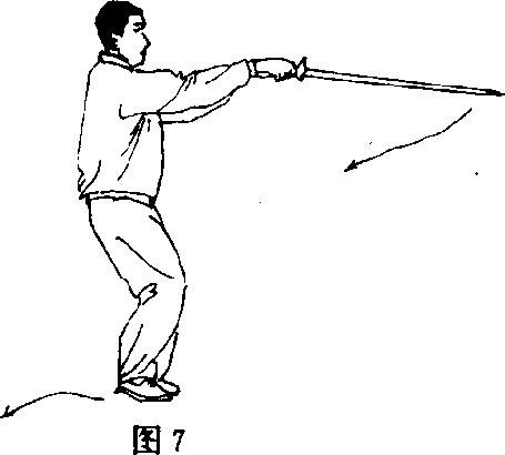 左手食指向中指一侧靠拢,右手松开剑指,虎口对着护手,将 剑接换过,并使剑在身体左侧划一立圆,然后剑尖向前下点,并略 向下垂,右臂要平直;左手变成剑指,附于右手腕部;同时右脚前进 向左脚靠拢并齐,脚尖向前,身体略向下蹲;眼看剑尖(图7) 0