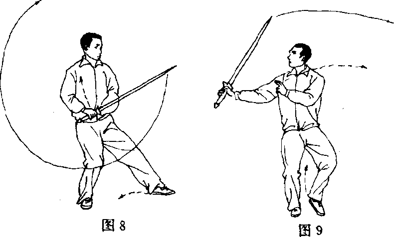 (1)右脚向右后方撤一步,随即身体右后转;左脚收至右脚内 侧,脚尖点地;同时,右手持剑经体前下方撤至右后方,右腕翻转, 剑尖上挑,左手剑指随剑回撤,停于右肩旁;眼看剑尖(图8、9)。