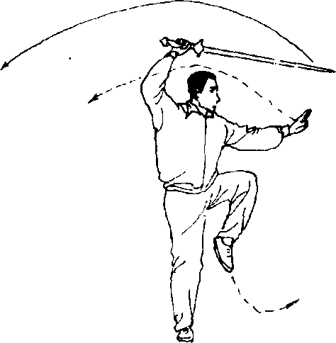 (2)上体左转,左腿提起,卿尖下垂,成独立步;同时右手渐渐 上举,使剑经头部前上方向前刺出,拇指向下,剑尖略低,力注剑 尖;左手剑指则经下须处随转体向前指出,高与眼平;眼看剑指(图