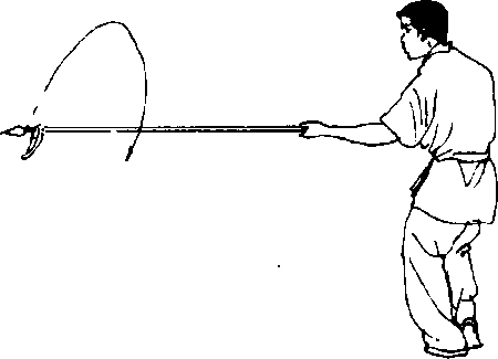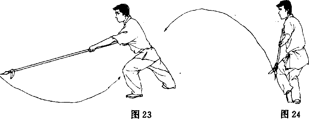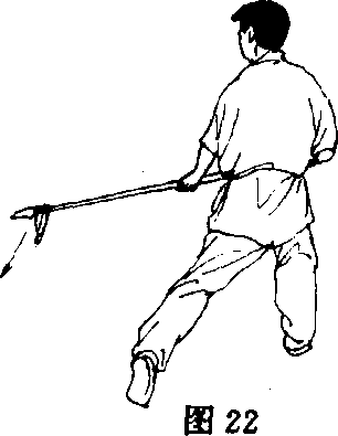 (1)起身,左脚向左开步,重心偏右腿;同时,两手握枪使枪向 下向左绕环圈枪,而后下落体前,枪尖斜向下同膝高(枪尖和胸均 朝西北方向);眼视枪尖(图22)。