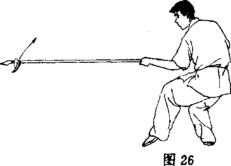 右脚向后退步,随之左脚向后撤步,左脚尖点地,两脚屈蹲,重 心偏右腿成左虚步;同时,两手握枪使枪向右向上向左向下反劈 枪,枪尖至腹高,枪身要平;眼视枪尖(图26)。