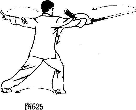 1. 右手持剑向内屈肘收臂,使剑身略向内收,然后再伸 臂向右前上方平剑刺击,剑身斜向前上,剑尖高与头齐;左手 剑指同时向左侧方直臂伸摆,手心向下、剑指向左上方。目视 剑尖。(图625)