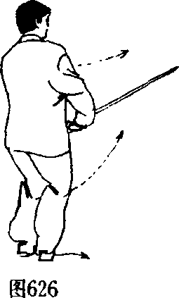 2. 右脚向左、向内横退一步,收靠贴于左脚内侧,脚尖着 地。双腿屈膝半蹲,双手向内合手屈臂,右手持剑向腹前转臂 收带,手心向上,剑身斜向前上方,剑尖高与胸齐佐手剑指向 内收贴附于右手腕上。目视前上方。(图626),