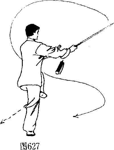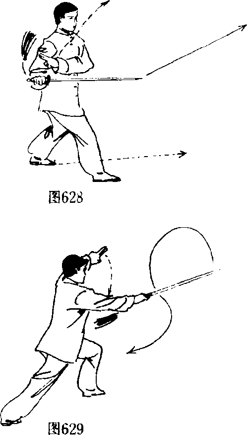 左脚向左后方落下退步,身体后坐,重心后移至左腿,身 体向右略拧转。同时,右手持剑先向左、向后划弧抹剑带提, 再向下、向前、向右于腹前平抹剑,使剑身于体前走“S”弧形, 剑身平直于右腰前,手心向下,剑尖向左;左手剑指随之跟附 于右手臂内侧。目视左前方。(图628)