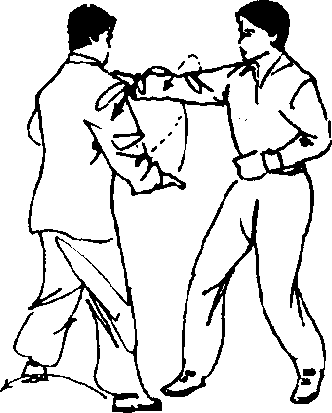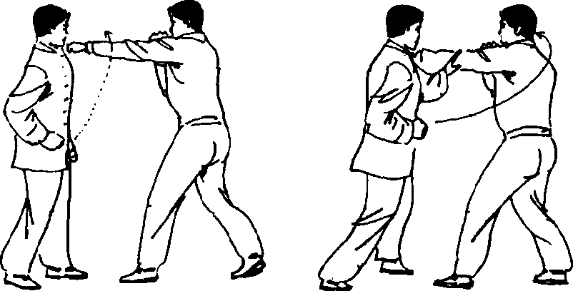 [要 点]左手顺乙方左拳之冲劲,顺势向左下方捋化, 使其前仆,再乘而攻击。横掌挥臂,“拥”劲横击。