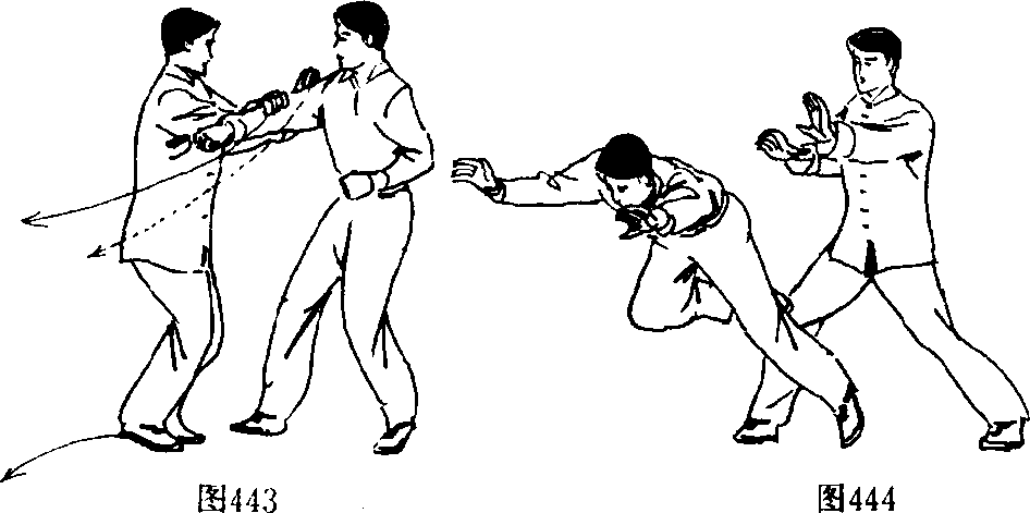 2. 甲方右脚向后退撤一步,身体右转,并出双手向上拦 截乙拳,粘其手臂,向右后方“捋”劲拽带,使乙方向前仆出。 (图 443.444)