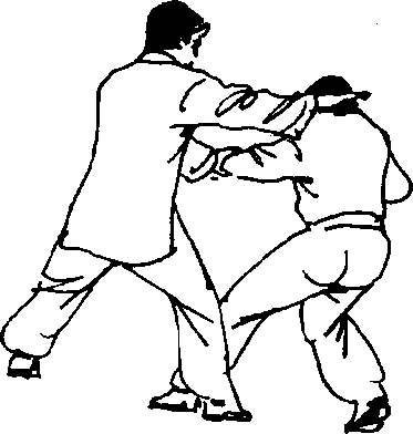 [要 点]双手拦截要及时,并顺乙方之冲拳侧身捋化, 以巧制拙,此亦为“四两拨千斤”之势。同时,右脚回撒后,脚 尖内扣,拦绊乙腿,破坏其重心平衡。