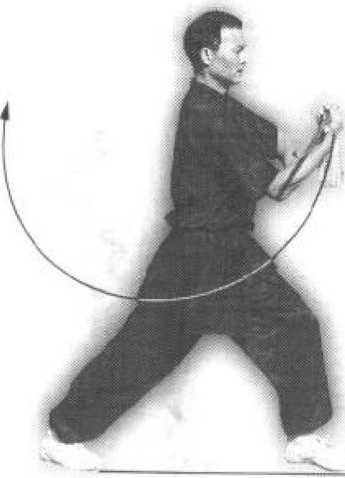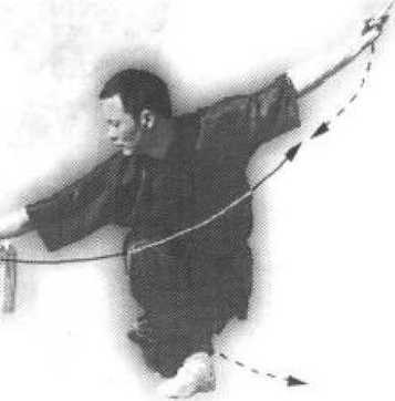 接上势,重心前移,身体右转 90。,右脚向左上步与左赧交叉。同时,右 手持剑以腕为轴向下、向右、向北在石胃 外侧腕花一周立剑于身体左侧前,手心向 里.剑尖向上;;左手剑指手心向下按于右 腕处(图38-以图 38-2(2)上动不停,上体略右转,两腿屈 膝下蹲成右歇步。同时,右手持剑经体前 向右侧下方斩截;左手剑指直臂后摆,手 心向上,剑指斜向左,高与头平。目视剑 尖(图38-2)。要点:歇圻和下斩剑同时完成;手腕灵 活,抖劲发力配合协调,眼随剑走。图39