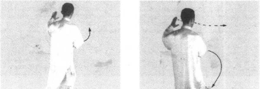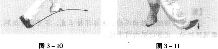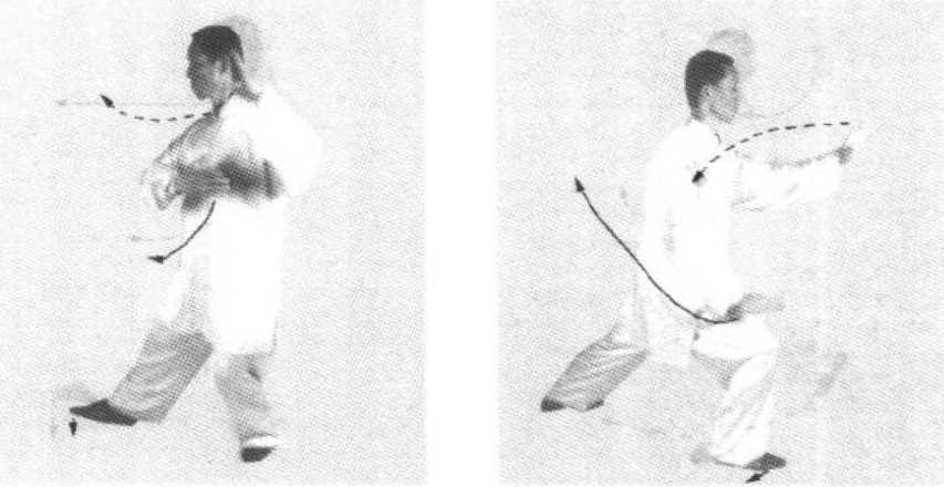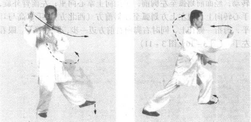 ⑦ 凡进步变换动作,不可后坐重心。脚尖微抬、外撇或内 扣,重心移至脚跟,转动腰、就带动进步,这是杨式太极拳与其 它流派太极拳不同之处。
