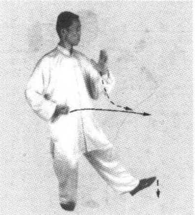 4. 右脚尖外展45度,向右转体,重心移于右腿,左脚向前 迈出一步,同时右掌变拳,收至右侧腰际,拳心向上,左掌经面 前向右划弧至胸前右侧,掌心向里,手指斜向右上方,眼随转体 方向平视。(图3-82、图3-83为正面图)