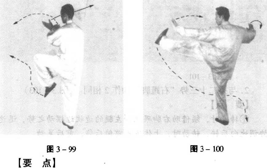 1 .右脚尖外展45度左右,向右转体(面向北);两拳向左 右划弧分开,同时变掌,向内、向下划弧合抱交叉于胸前,掌心 向里,手指斜向上,左掌在外;同时收左腿,并向左肘下提膝, 眼向左平视。(图3-99) ?