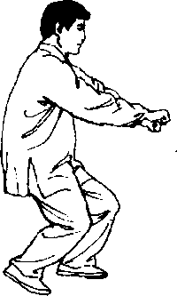 【双炮捶】武式太极拳式。左 脚上步变实,右脚跟步虚点于左足 后,双手为拳,随上步跟步而提起并 向前下方击出。如图。