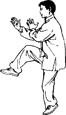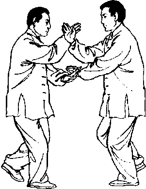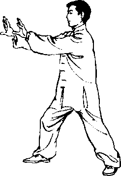 【双推手】陈式太极拳式之 一。左右手臂分别作小大缠丝,并 以腰带动合于身体左侧,此为欲右 先左。双掌掌心向夕卜、向前发劲推 出,同时双脚随之上步。如图。