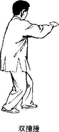 【双撞捶】孙式太极拳式c双 手为拳收于胸部,左脚上步,双拳向 前撞出,拳心向下,两臂微屈,同时 右脚跟步c如图。