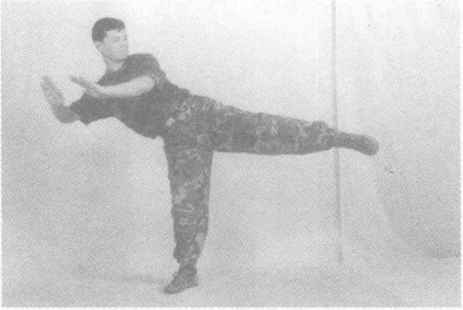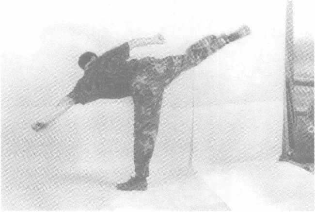 要点:击打要快速有力,支撑腿要稳;动作协调,摆踢时,头颈 拧转方向与腿部摆踢的方向相反。