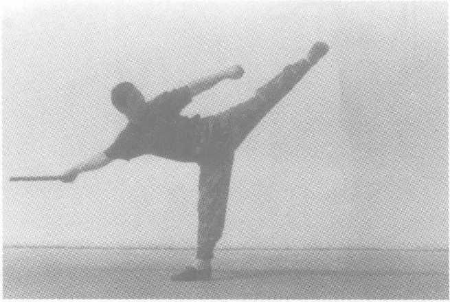 1 .左后摆踢:预备姿势开始,右脚向前上步,重心移于右腿; 左后转体360度,上体稍侧倾,同时左腿蹬地,随转体,由左向后、 向前横扫,脚面绷平,力达脚掌,目视左脚。