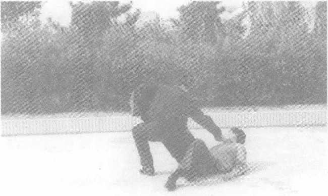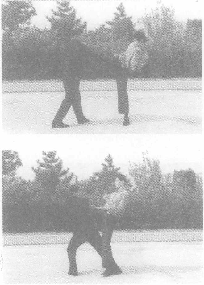 实用技法在格斗势的基础上,当敌起右腿横踢我上体时,我进步向左转 体的同时,用左抄抱动作接敌脚踝和小腿;右手用力抓压敌方其脚 踝或小腿,身体猛向左拧转,同时伸右脚向后扫绊住敌支撑腿,将 敌摔倒;随即,膝跪裆部,拳打头部,将其制服。实战要求:接腿准,上步、绊腿、旋压迅猛连贯,跪裆狠。