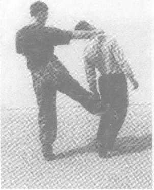我从敌背后接近,突然起右脚踹击敌膝窝,双手做好锁喉、抓 腕的准备;