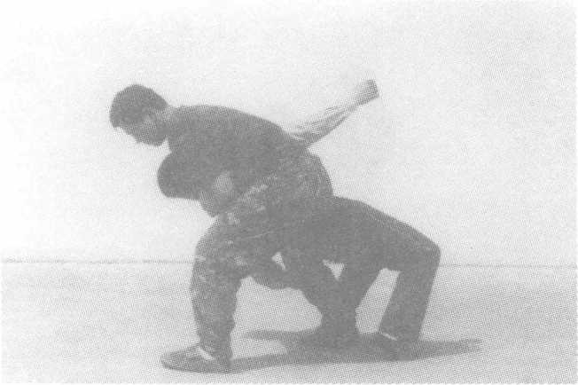 我从敌背后接近,右腿在前,屈膝下蹲,用两手沿敌两腿外侧 抱其双膝;两手合力后拉上提,同时以肩部前顶其臀部,将对方摔 倒。敌倒地,我迅速骑在其腰背上,两手用力推按敌头撞击地面, 乘其抬头之际,左手后扒其额,右臂锁其喉。左手抓其左手前送后 拉并用左腿挟住,然后换手控制其右臂。