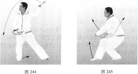 重心移向左腿,身体继续后转;右脚提起稍向右移动,前脚掌着地, 脚尖向前,成右虚步;上体向下松沉,微向前俯;左掌经头前自上而下横 压于右膝上方,掌心向下,指尖向左,拇指向内;右掌按于右胯旁,指尖 向前。眼看前下方(图245 )□