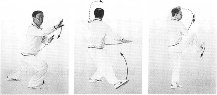 (2)提脚独立时,重心后移,右脚尖上翘,右腿先上举后屈膝,右脚 划一弧形盘收于裆前。同时两手在向下划弧中分开。