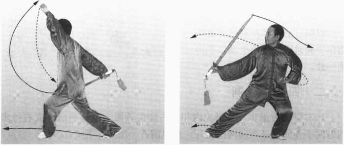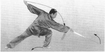 (2)崩剑时上体略向后仰。撤步时以右脚前掌为轴,身体向左后转。 反刺剑时剑与两臂成一条斜线。上体略向前倾。