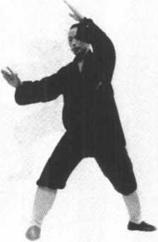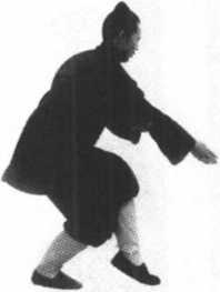 1 .身体后坐,重心在右腿上,屈膝坐身,收回左脚,左脚 在离右脚尺许处虚尖点地,同时左手下沉,右手五指并拢,从 左臂上肘窝处向下插出,左手托右臂肘节处(图69)。