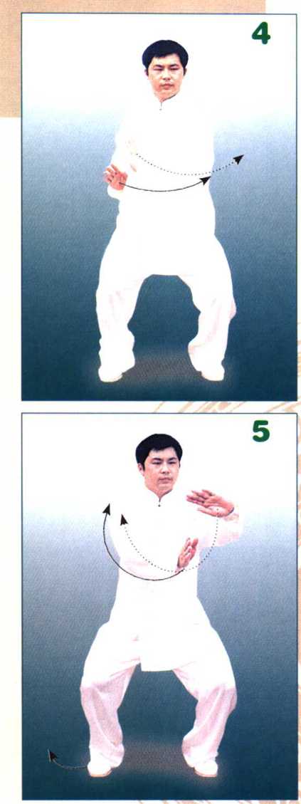 同时两手向上向右划弧至右侧肋、胸 前;左手掌心向右,掌指向上;右手贴 与右肋侧,掌心斜向前,掌指斜向上。 (图4)