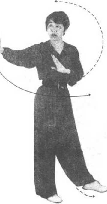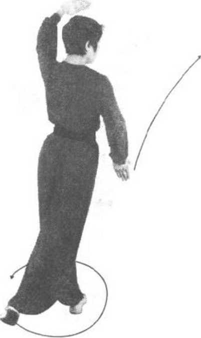 左脚向左前方90度落步, 脚前掌着地,身体右转45度。右 手随体向右摆掌,指尖向上,掌 心向外;左手内旋划弧至胸前立 掌,指尖向上,掌心向外。目视 右掌。【要求】 左脚落地双摆掌要求与转身协调一致,不可弓 腰、收腹.左脚跟内跟落地,重心前 移,身体左转90度;右脚跟离 地。左手向下、向左、向上划弧至 左额上方,掌心斜向上,掌指向 右;右手向下屈肘收至腰间,掌 心斜向前,指尖向下。目视前沉。沉。【要求】 跟脚传体与划弧架掌要协调配合,不可弓腰下沉。沉。