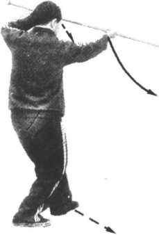 1. 图 23-6图 23-6借右拧上身,右脚不动,左膝里扣,左 脚向前进方向右45。垫上一步,重心侧重在右 脚;同时左手持棍后把下落左肩前,右手边向 前滑把,边下持棍梢至左脚尖前上向;目视棍 前方(图23?7)。
