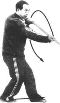2. 动作不停,重心前移左腿,右脚跟进 左踝里侧,成右提步;同时右手顺势下捋把, 贴身左侧上弧线倒把挂棍,使右手心向里持 棍后把落至腹前,左手心向上持棍停至左肩 前;目视左手(图23⑻。