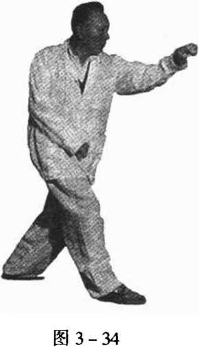 1 .由三体势,左手循内弧线下落,右拳向前、向上栽出 (图 3-33)。2 .右手循内弧线下落,左足由顺足向前进半步,变成外横b国术丛书嫉龙文理荻步7足;左拳向前、向上栽出;同时,右足向前进一步(图3-34)。 如此一左一右地练习即可。要,领①拗步单马形,其劲力发出时应主于腰部,实主宰于龟尾;②右拳向前栽出时,左手要有向下、向左领捋之意;左拳向 前栽出时,右手要有向下、向右领捋之意。用法与上节相同。回身法与钻拳相同,请参阅。
