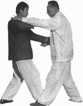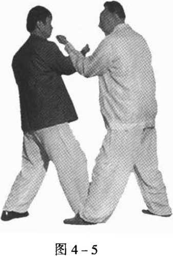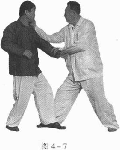 甲方在乙方以右钻拳进击的同时,左足退一大步,落于右足 之后,成外横足;右足也向前进一大步,落在乙方右足外侧之后 成顺足;在退左步的同时左手先向右、再向下、而后向左(这个 圈要尽可能走得越小越好)刁抓领捋乙方之右臂;同时,右手以 顺步横拳击乙右侧胸肋部(图4-5)。图4 一 6图4 一 6图4 一 6图4 一 6,国术丛书